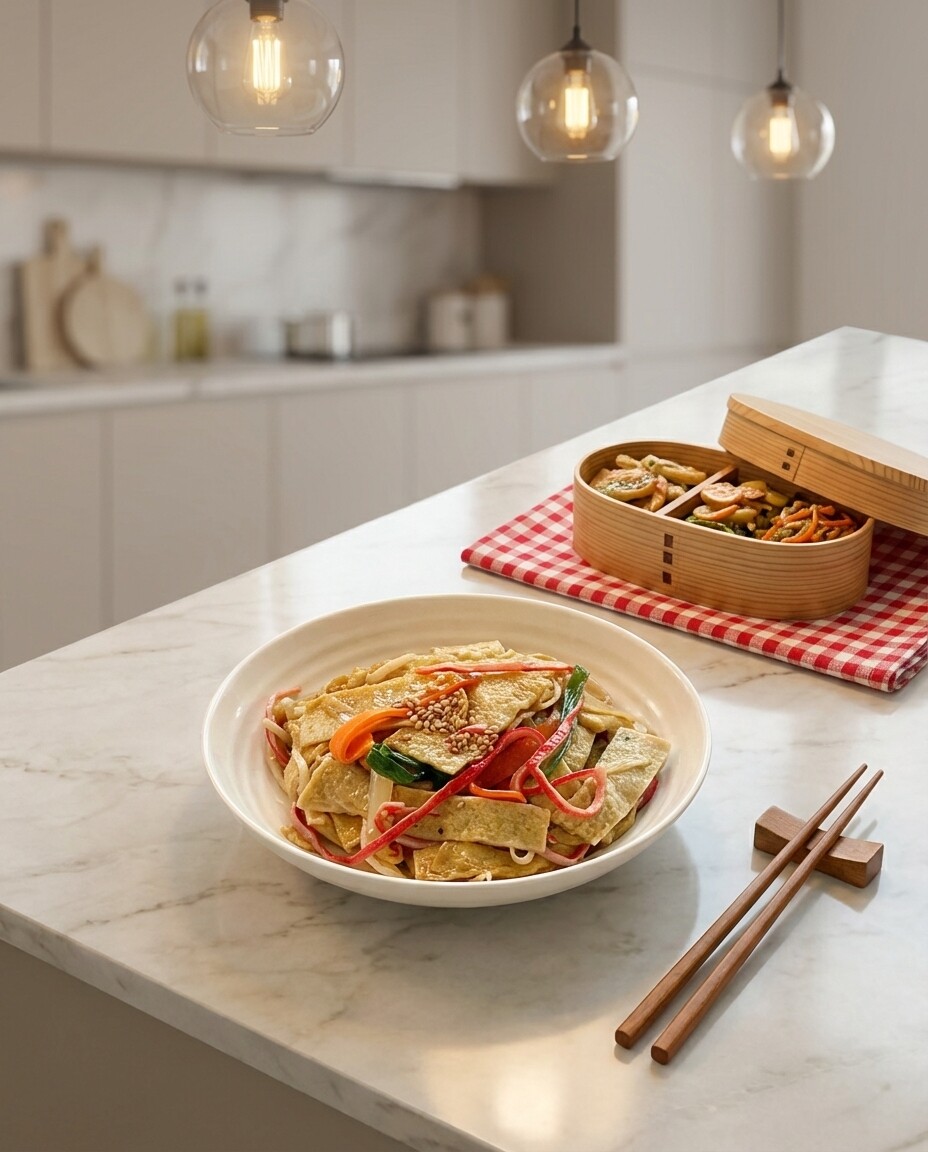 튀김어묵과 구운 어묵 등을 다양하게 섞고 여기에 맛살채로 맛의 다채로움을 더했습니다.