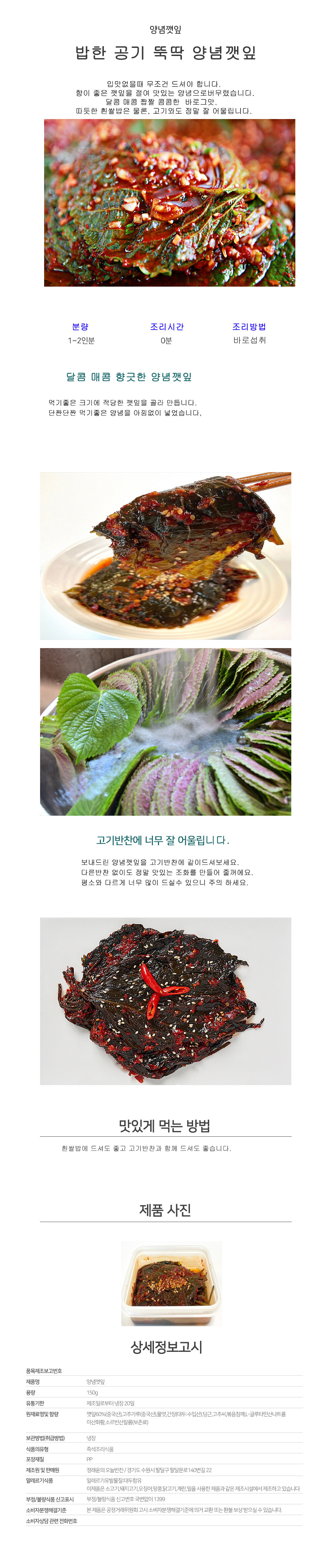 누구나 좋아할 수 있는 매콤 칼칼한 양념으로 깻잎 특유의 향을 살린 것이 특징이지요. 따끈한 밥에 싸서 한 입 물면 고기반찬이 부럽지 않습니다.