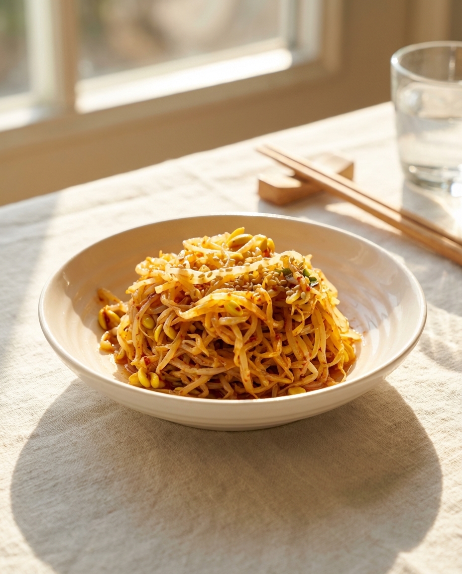 평범한 반찬이지만 국간장을 이용해 자극적이지 않은 정제된 양념으로 고춧가루, 다진 파, 참기름이 감칠맛을 더했어요.