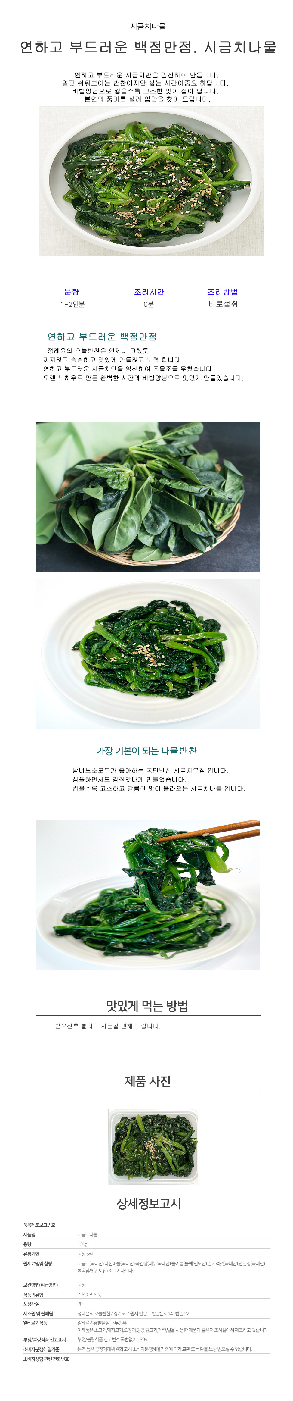 그날 공수한 신선하고 질 좋은 시금치만을 엄선해 국간장과 다진 마늘 등으로 양념해 만들고 있습니다. 뽀빠이 기운을 불어 넣어주는 시금치 나물로 기운을 북돋워주세요.