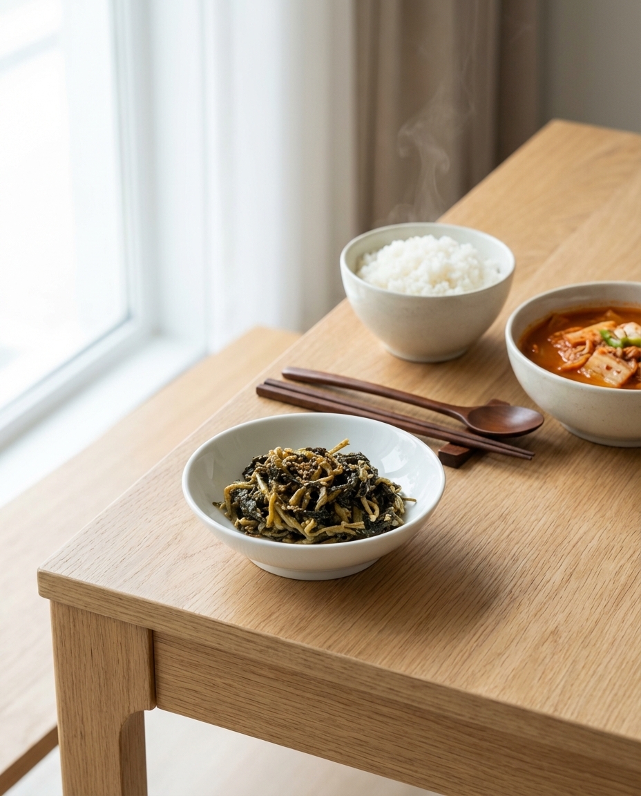 아삭한 무에 다진 마늘이 알싸함을 더하고 들기름으로 정제되고 담백하면서 고소한 맛을 냈습니다.
