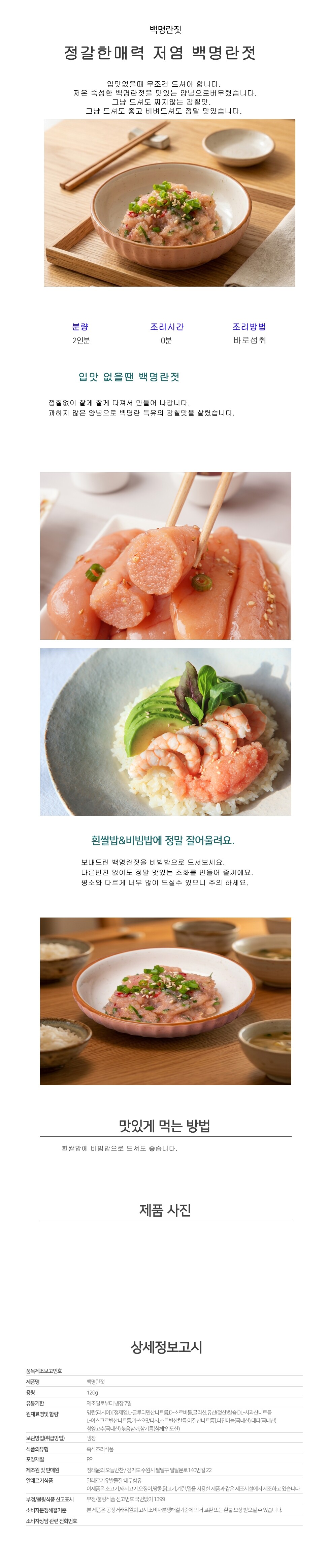 저온 숙성한 백명란젓을 맛있는 양념으로 버무렸습니다. 그냥 드셔도 짜지않는 감칠맛을 느낄수 있습니다.